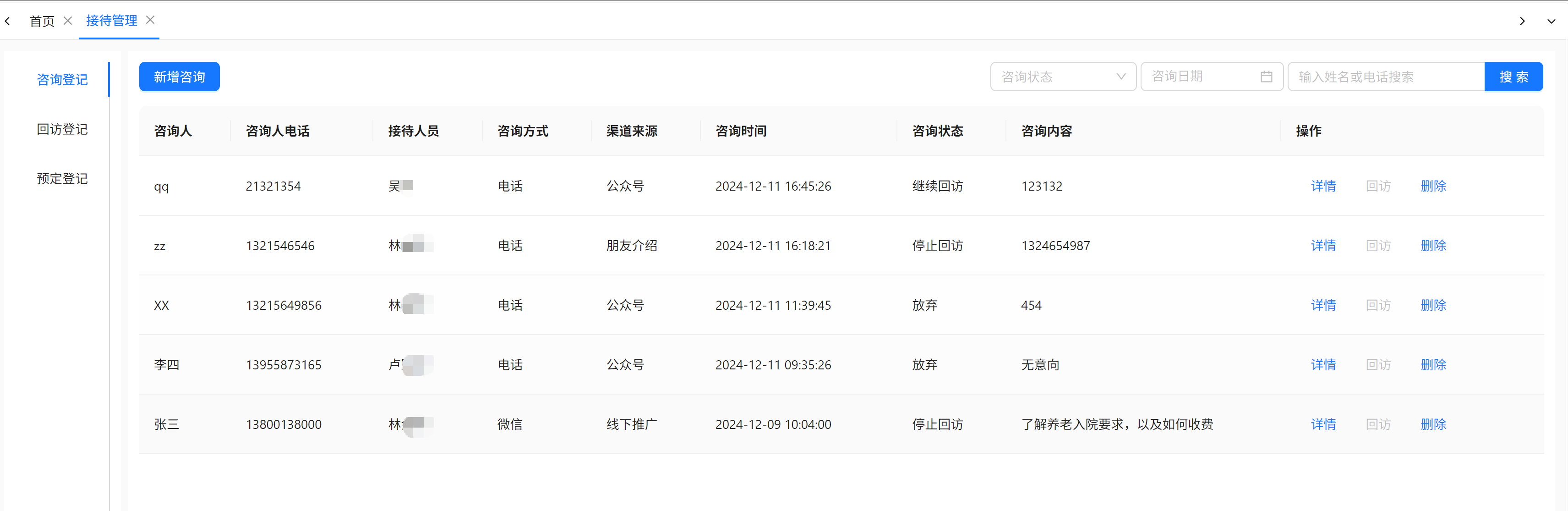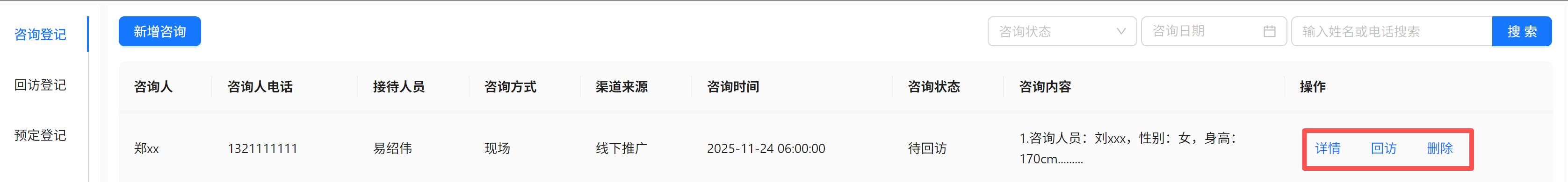 在确认完成咨询登记之后会生成一条咨询数据,如上图,该数据可进行详情查看、初次回访、删除数据等操作。