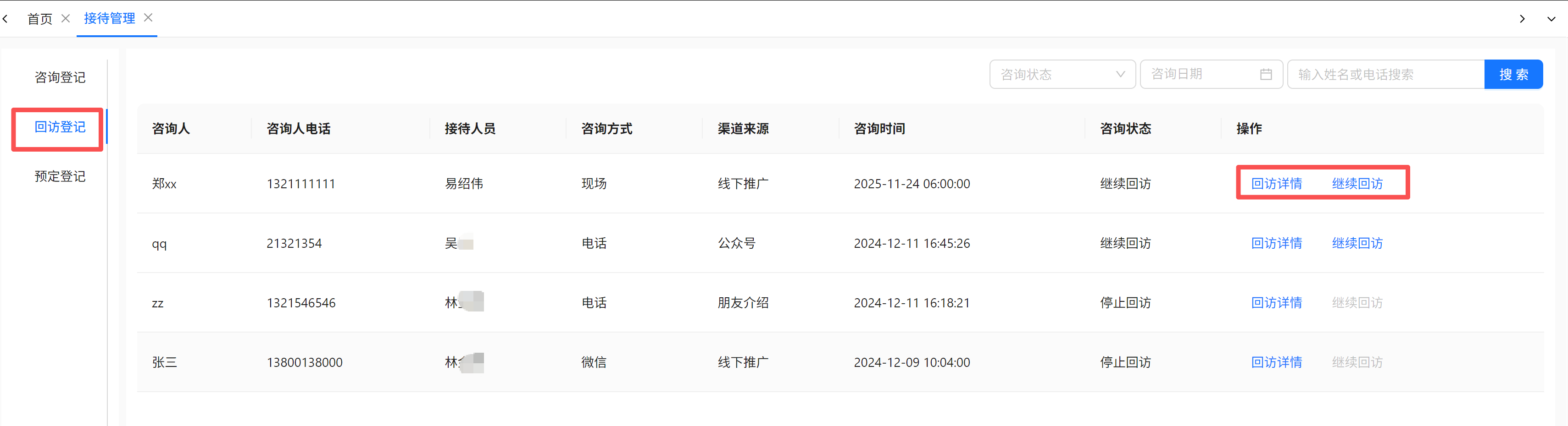 在回访登记功能里面,可以看到经第一次回访后还待再次确认以及回访的目标数据。数据会有两种状态:继续回访和停止回访。两种状态皆可以查看回访详情。