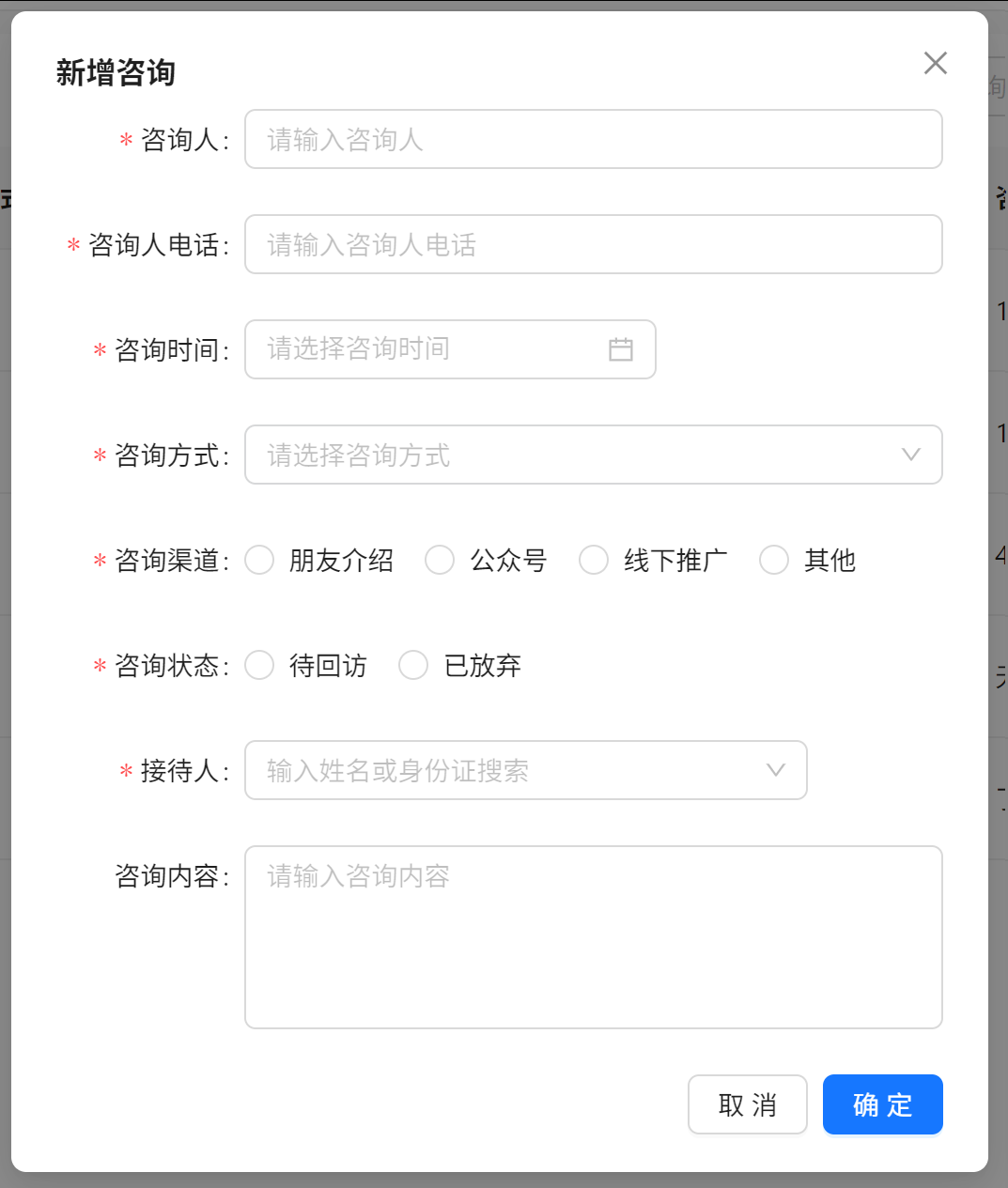 点击新增咨询后,在弹窗页面输入咨询信息,咨询方式可选择电话、现场、微信(后端可调整),接待人输入选择负责接待的工作人员,咨询内容按机构咨询内容标准整理填写进去即可。然后点击确认完成咨询登记。