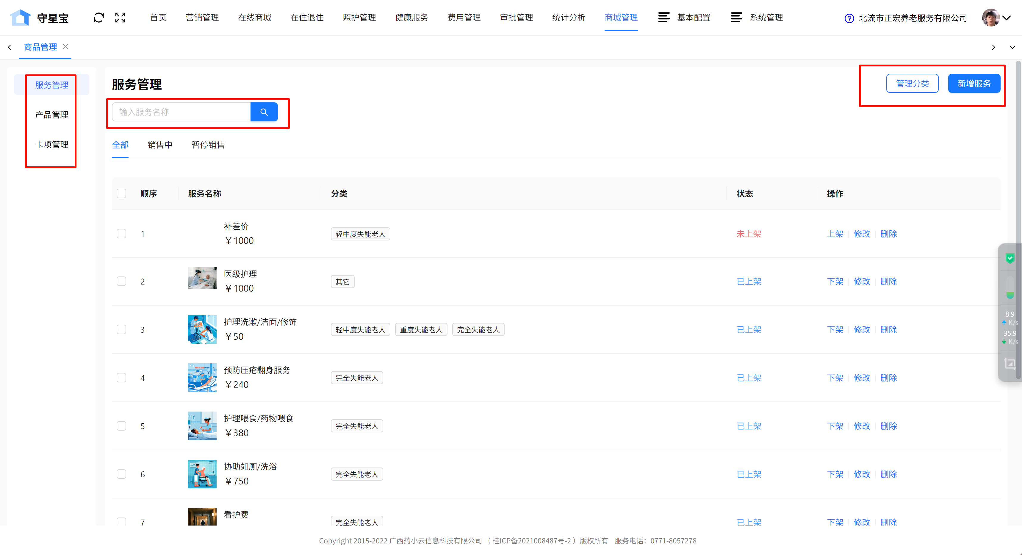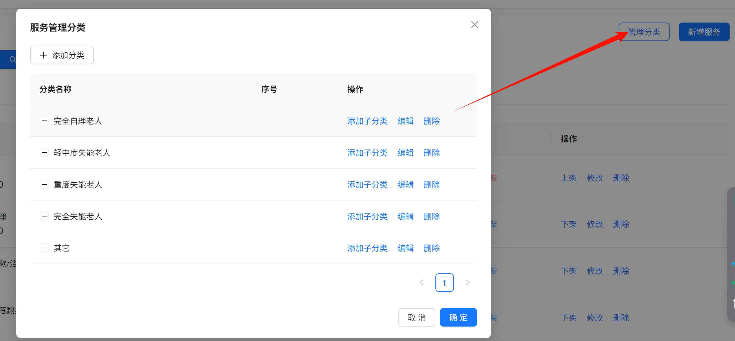 右上角可以进行管理分类的添加、新增服务的添加。接下来操作以服务管理项为例: