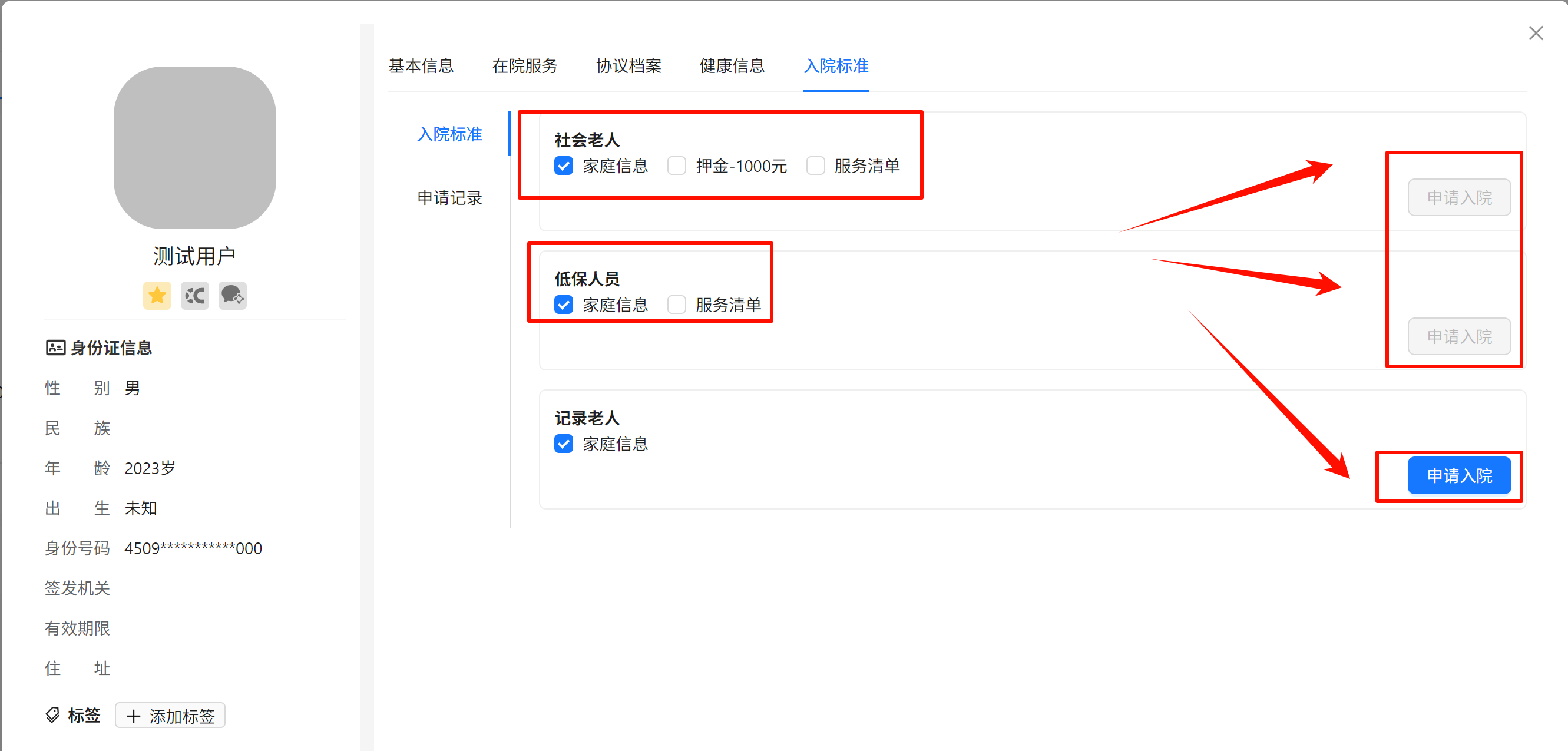 在入院标准中,不同类型的人员有不同条件要求,如押金缴纳、填写家庭信息等,需要完成这个条件才能点击申请入院。