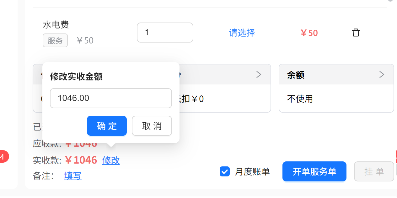 需要注意的是,在勾选月度账单的情况下,修改的实收金额款项是每个月月度生成的月度账单款项金额。即修改了之后,每个月都会按这个金额数生成账单。