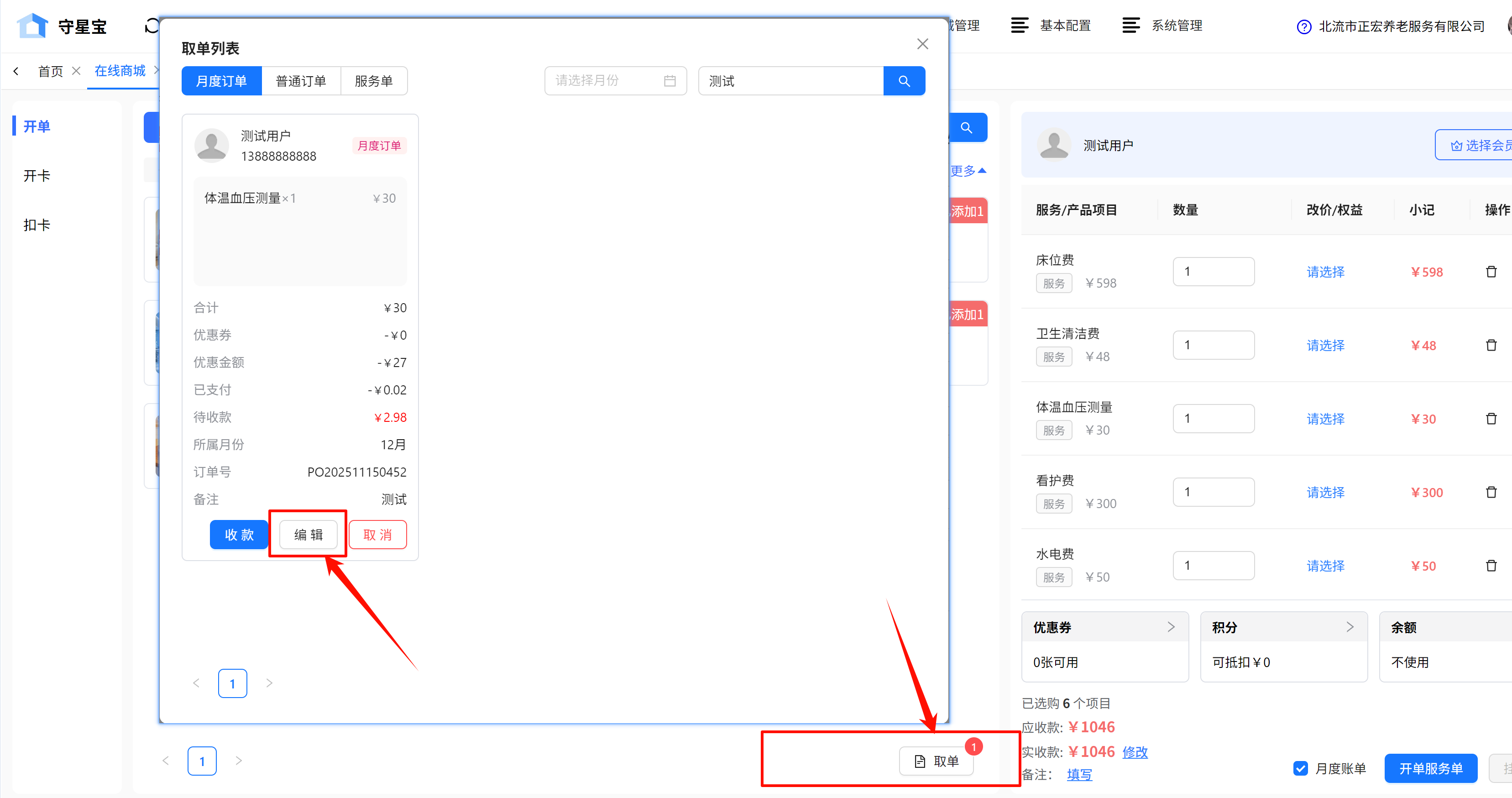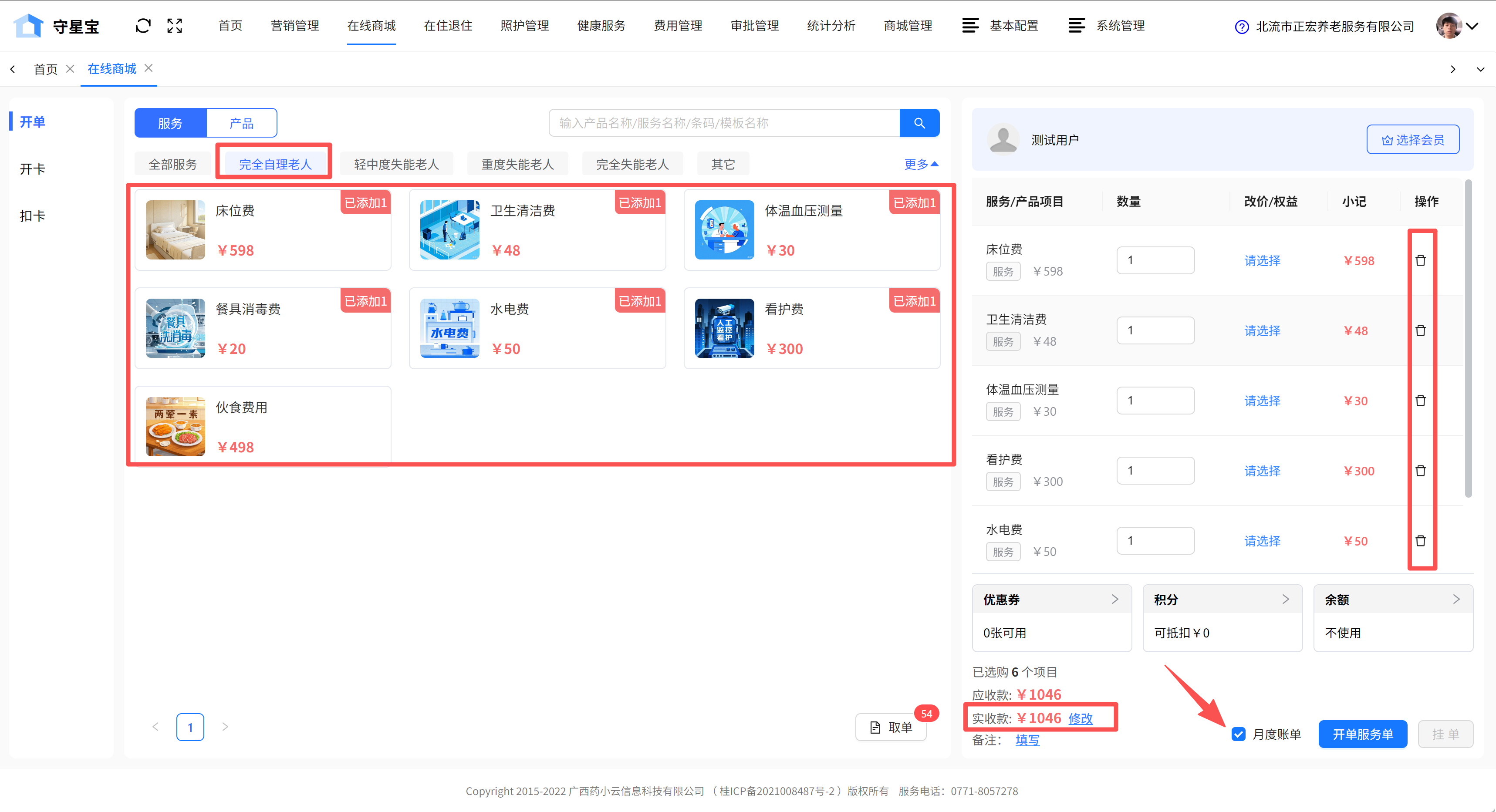 在在线商城中根据待定长者的评估等级,在服务商品栏内选择相应的服务。在右侧可以对已选的服务进行删除,确认无误后,勾选月度账单,若需要修改实收款,可直接点击修改进行金额修改。
