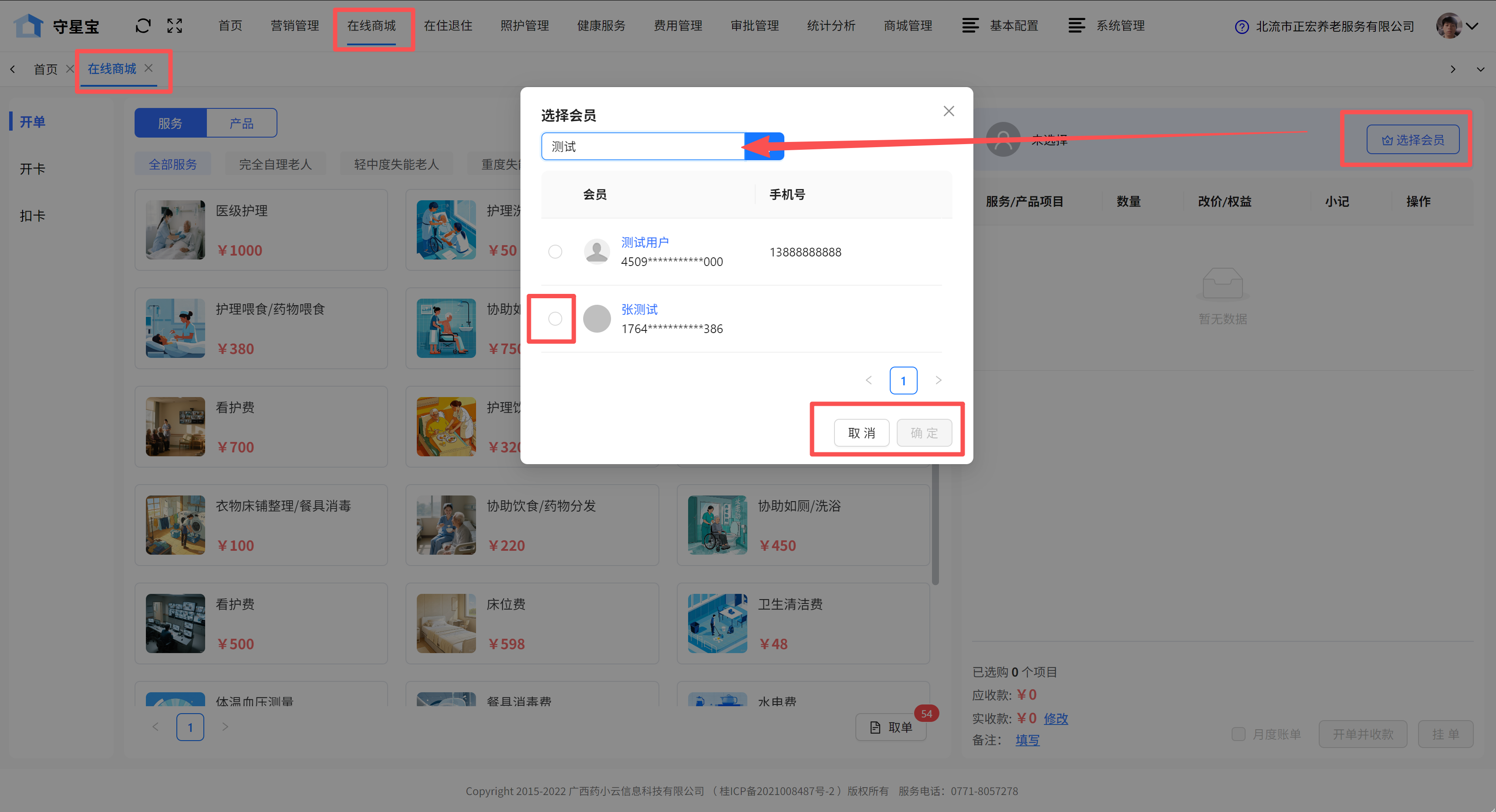点击在线商城功能选项-选择会员-勾选长者-点击确定