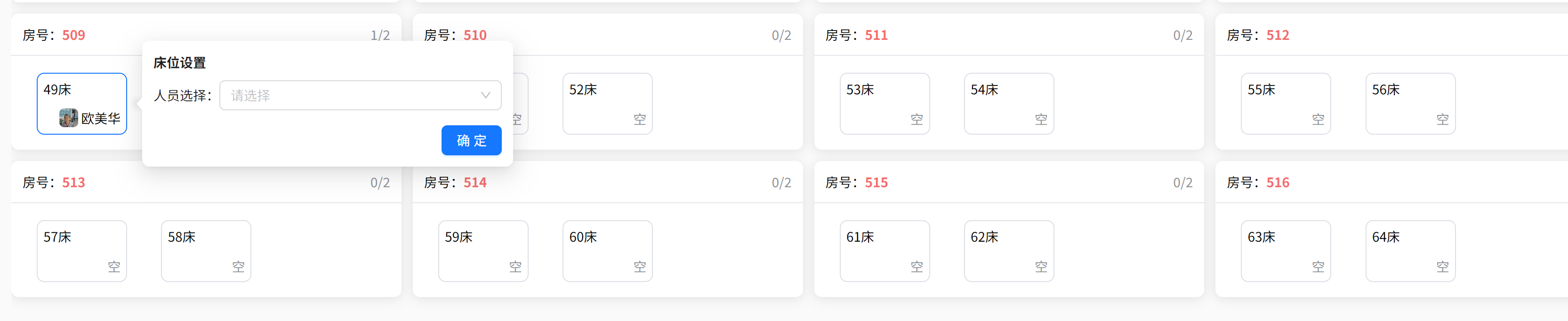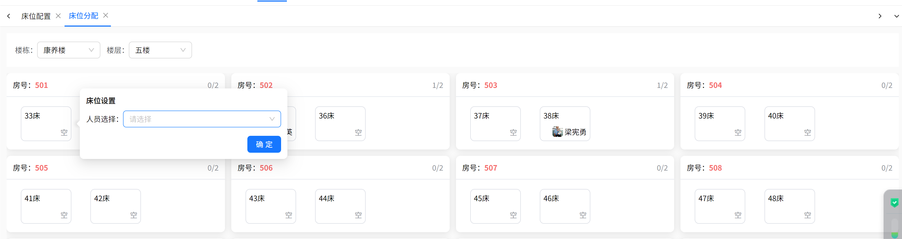 在已经分配的床位的情况下,也是按如上方法,点击床位进行人员选择即可覆盖当前已经分配的长者。