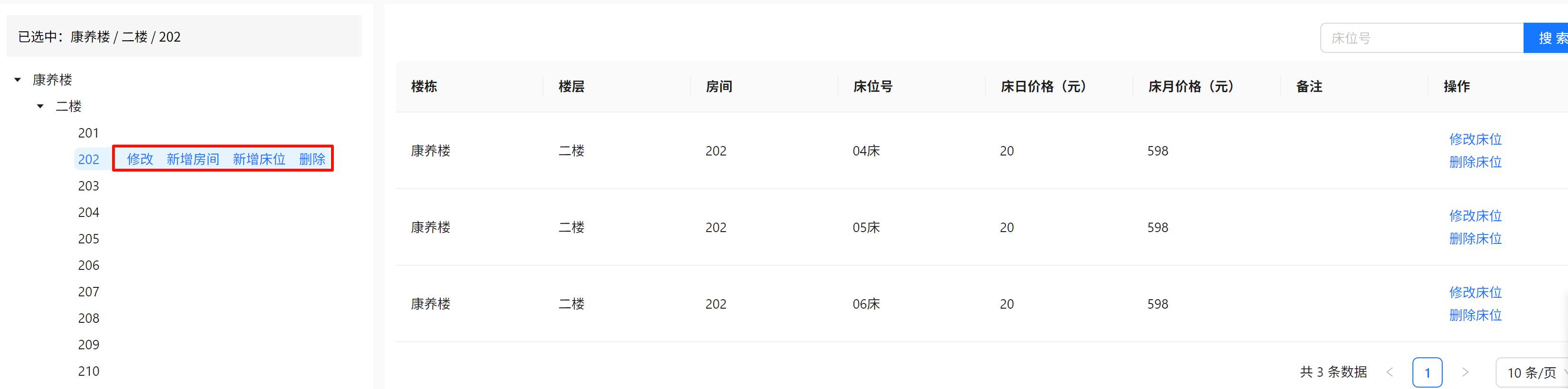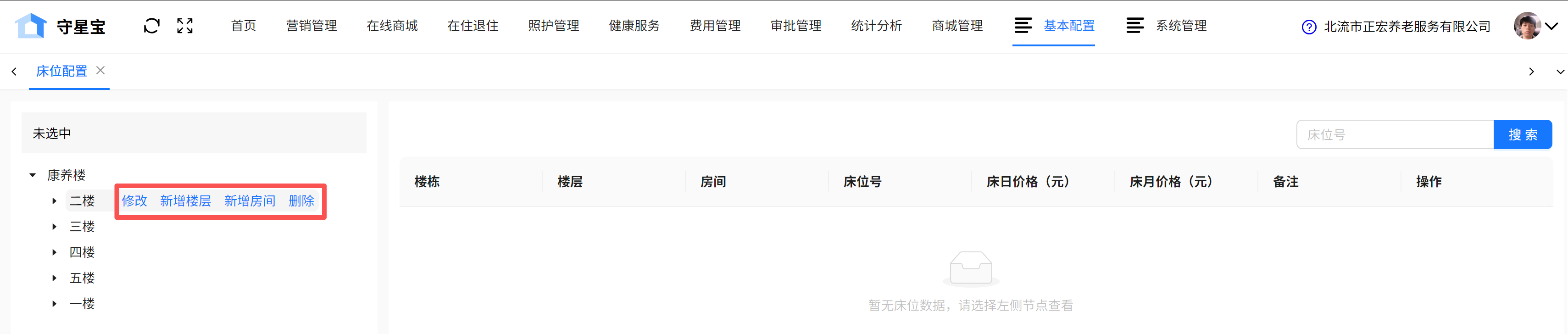 在基本配置-床位配置下,可以通过新增楼栋、新增楼层设置不同的楼栋,楼栋内的楼层。光标放到楼层的位置时,可以进行新增楼层、新增房间;光标放到房间上时,可以进行新增加房间和新增床位。