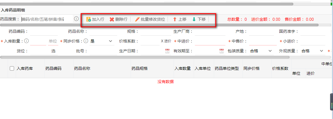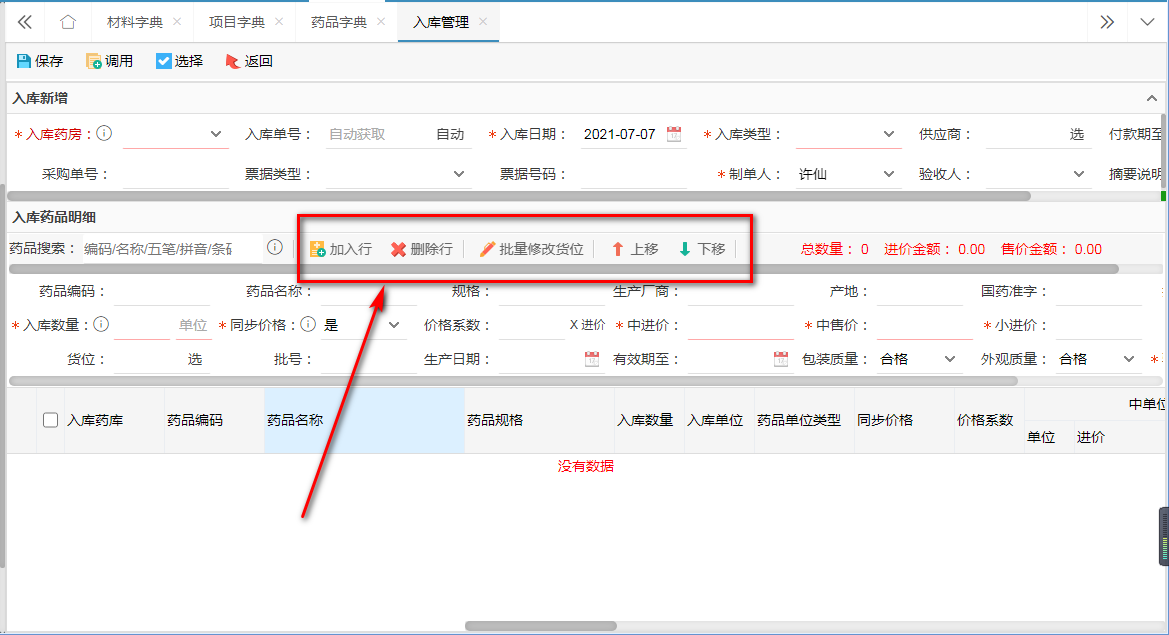 输入药品进行查询出来后可一路按回车键一边填写直到成功添加完一条药品信息,也可点击加入行,添加入库。