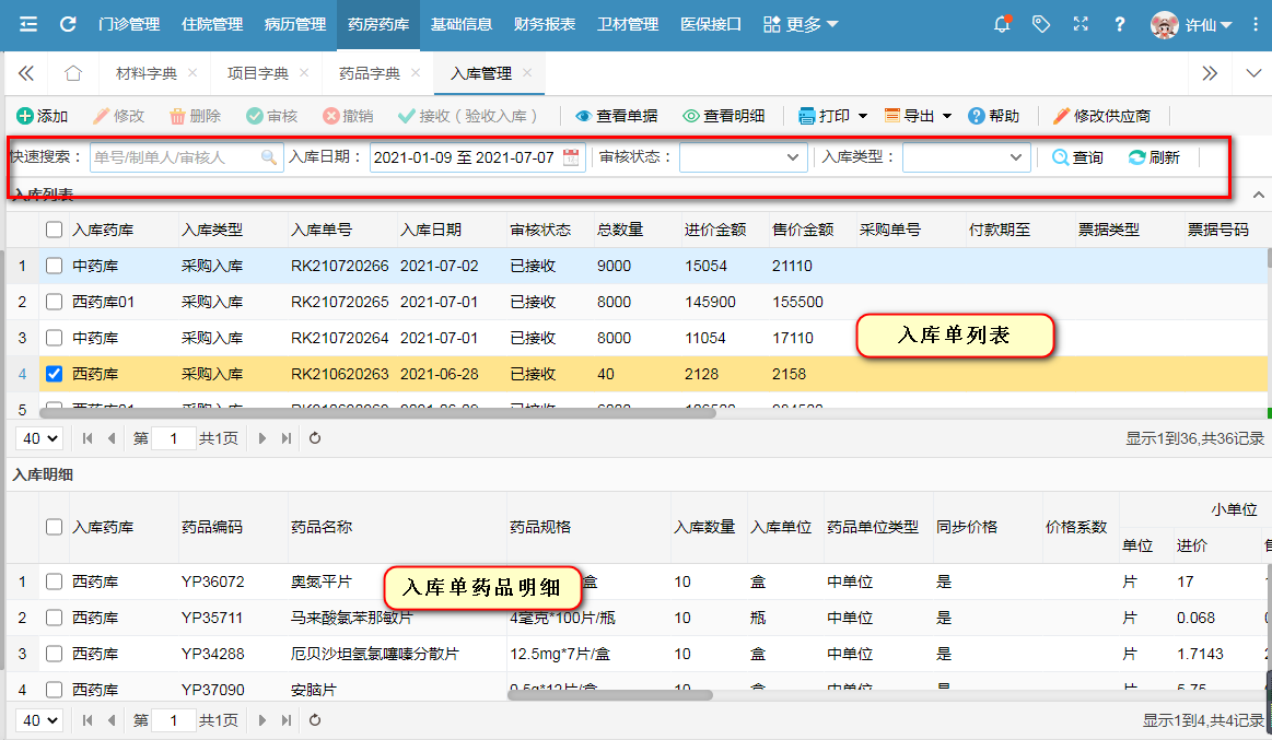 在本模块进行药库入库,如上图所显示可以看到页面有两处列表,主要分为入库单列表和入库单药品明细。可通过字段信息等进行快速查询。
