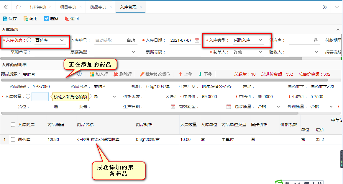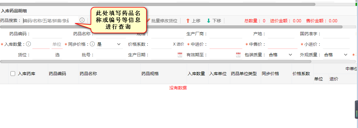 根据内容选择相应选择入库药房以及入库类型,在入库药品明细处输入药品名称进行搜索,而后填入相应入库数量、价格等参数信息查询添加入库。