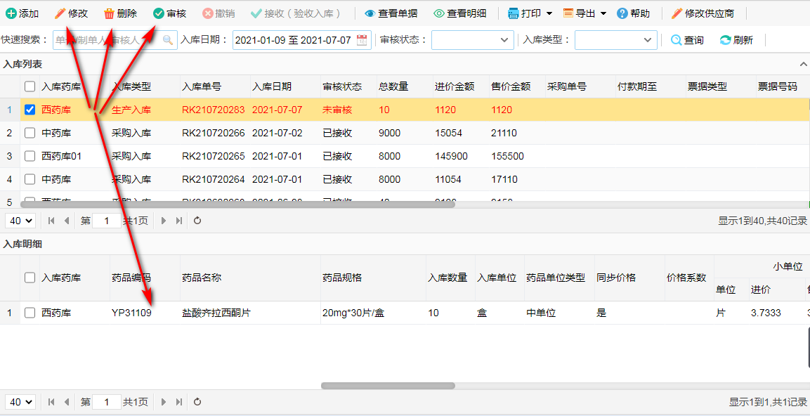 添加完入库的药品后,会生成一个入库单,入库单里面有相应的药品明细;