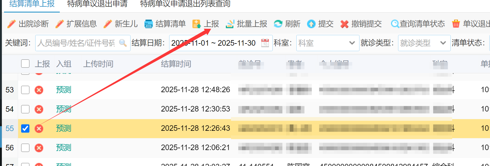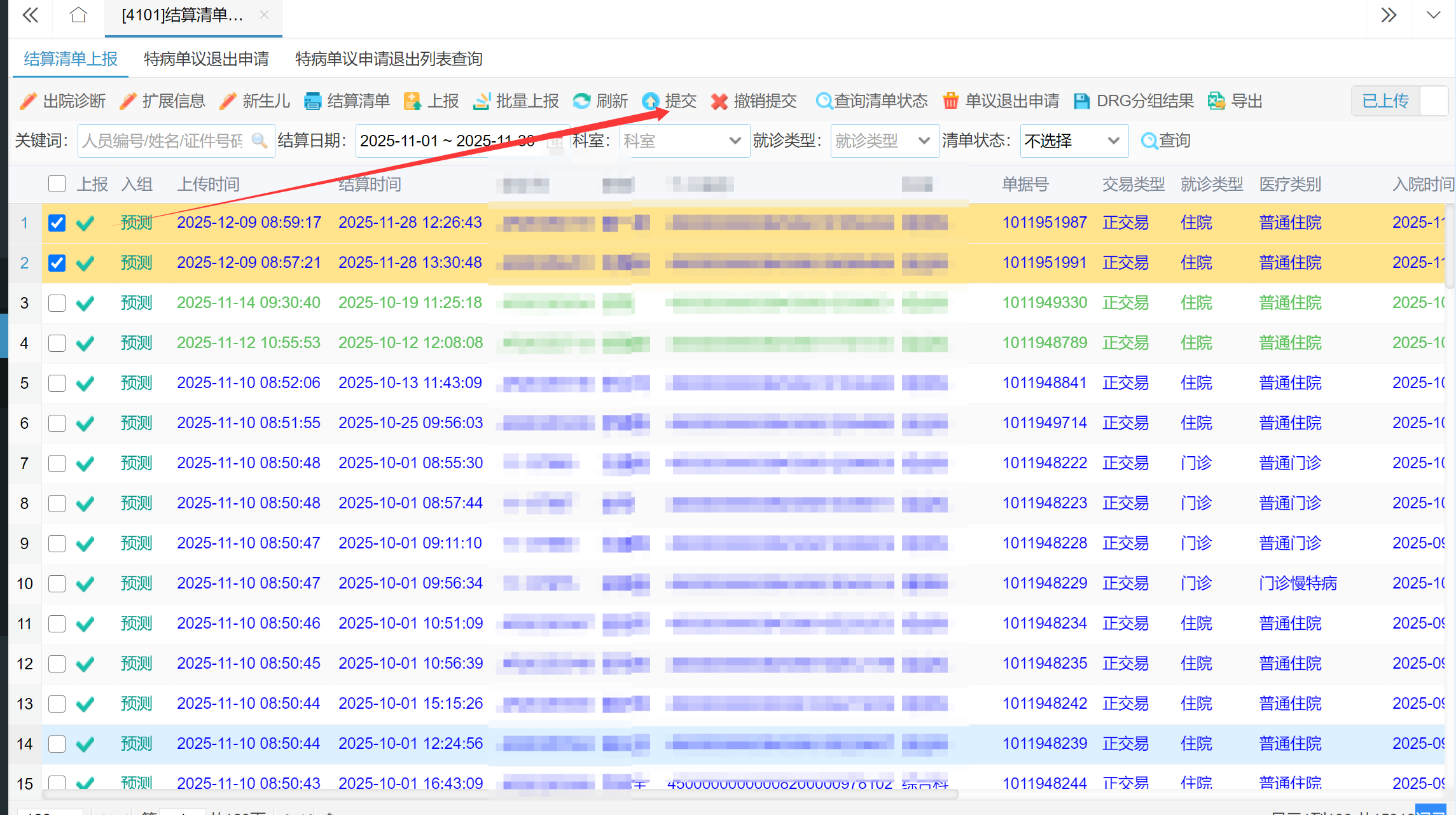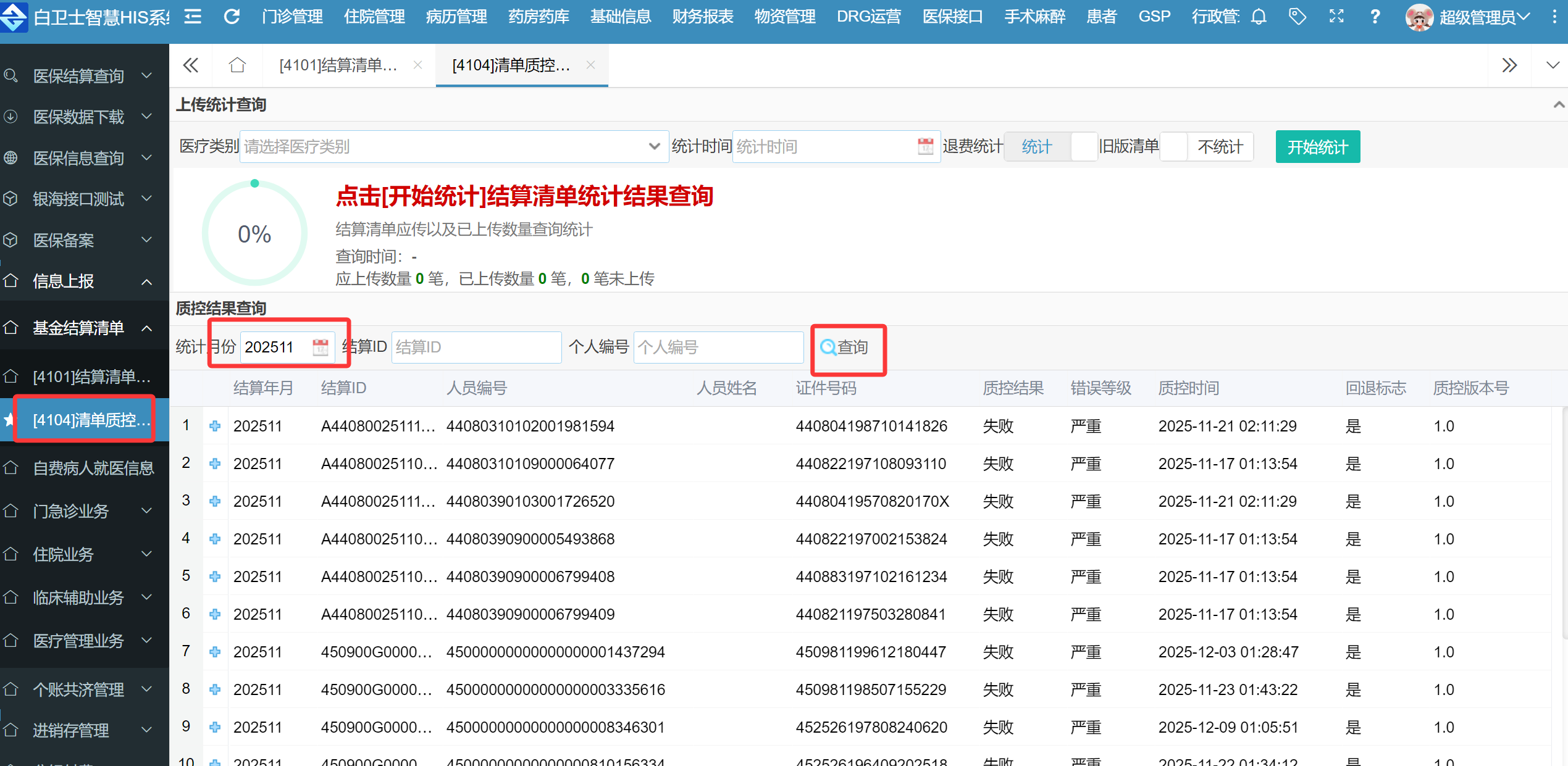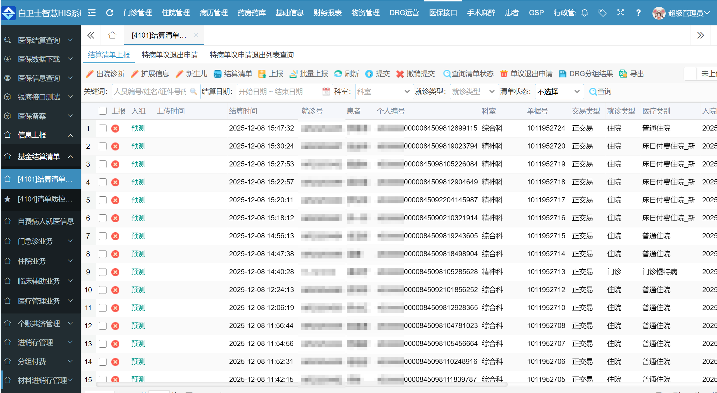 功能菜单:医保接口-信息上报-[4101]结算清单上传,如果没有找到此菜单,有可能是菜单未分配,请找管理员分配。